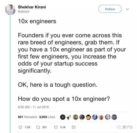 投资人Shekhar Kirani发了一条推文,建议初创公司牢牢把握住10倍工程师。10倍工程师长啥样?他认为这些人拥有以下11种特质: