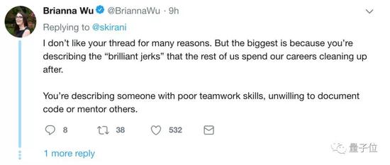 美国众议员候选人Brianna Wu表示反对的原因则是,这样的人根本不利于团队:
